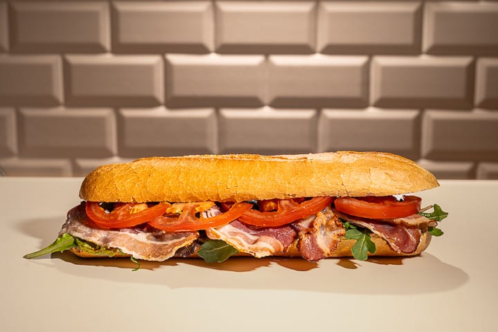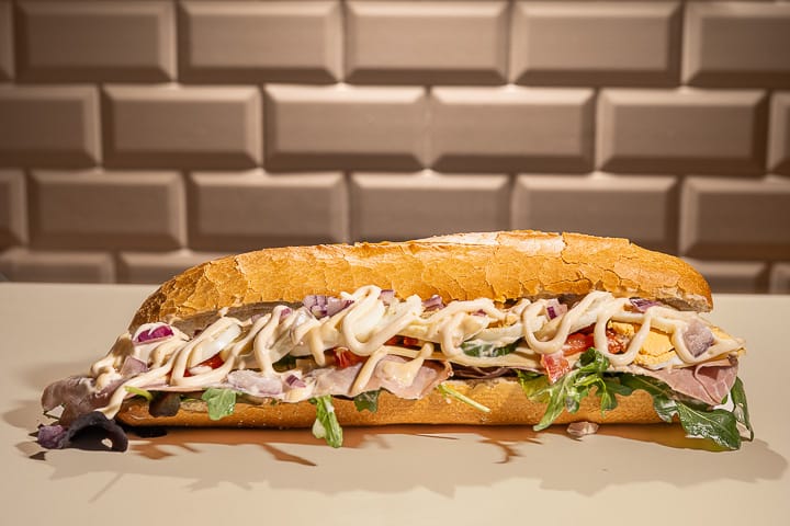 Halve stokbrood rijkelijk belegd met o.a. BLT, Hummus, Gezond, Filet American, Tonijnsalade & Eiersalade.